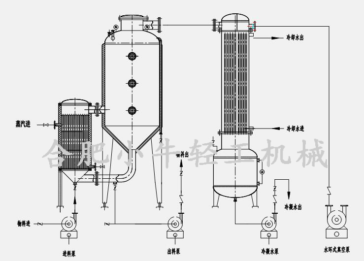 單效外循環(huán)蒸發(fā)器(單效濃縮器)是自然循環(huán)蒸發(fā)濃縮設備的一效形式,設備在生物制藥、保健食品、調味品、乳品飲料、日用化工、香精香料、環(huán)保工程等眾多領域具有廣泛應用??蓪χ兴幪崛∫?、發(fā)酵液、酶解液、蛋白飲料、化工溶液等多種料液在真空狀態(tài)下快速蒸發(fā)濃縮,有效提高料液濃度,或用于酒精等有機溶劑回收。