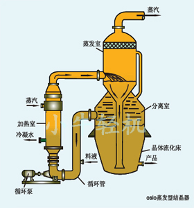 Oslo蒸發(fā)結晶器屬于典型的母液循環(huán)式蒸發(fā)設備,應用外部配用的加熱器對結晶器內部的循環(huán)物料加熱,使其再進入真空閃蒸室蒸發(fā)達到過飽和狀態(tài),再通過中央降液管進入懸浮床,在晶體流化床內,溶液中過飽和的溶質沉積在懸浮顆粒表面,使晶體得以成長。晶體流化床對顆粒進行水力分級,大顆粒在下,而小顆粒在上,從流化床底部卸出粒度較為均勻的結晶產(chǎn)品。結晶器上段的不飽和溶液進入強制循環(huán)泵,將料液進行循環(huán)蒸發(fā)結晶,在物料循環(huán)過程中,多采用清母液循環(huán),晶體不參加循環(huán)因此不易被破碎,結晶自結晶器中部取出不受沉降限制,晶體生長環(huán)境好,所以晶體粒徑大,可達6-20目,即3mm大。結晶器內不需要攪拌。